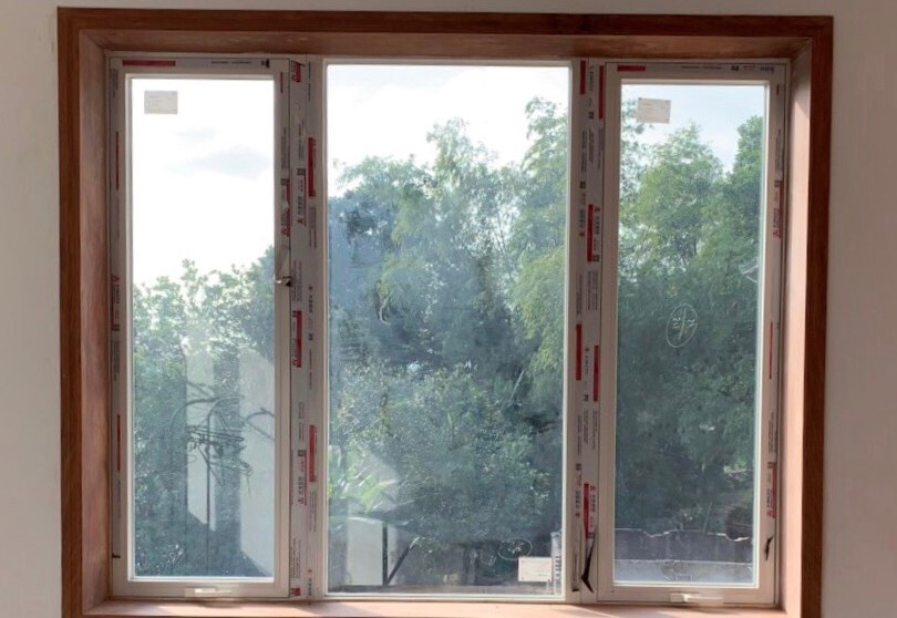 Về cấu trúc thì cửa gồm nhôm Xingfa hệ 55 độ dày 1.4mm, phụ kiện đồng bộ Kinlong, tấm kính của thương hiệu Hải Long, cùng những chi tiết khác tạo nên bộ cửa hoàn chỉnh.