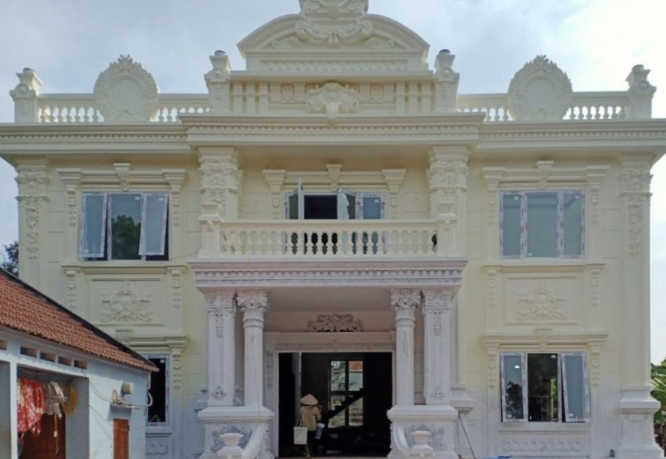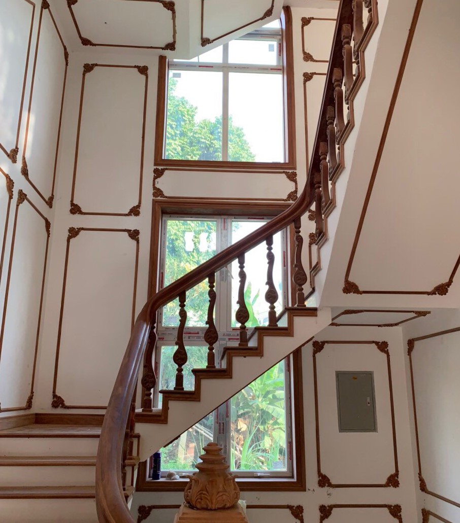 Đặc biệt ở công trình này lại sử dụng nhôm Xingfa màu trắng sứ, càng phù hợp với màu sơn tường và làm tăng vẻ đẹp với kiến trúc hoa văn cầu kì tinh xảo ở đây.